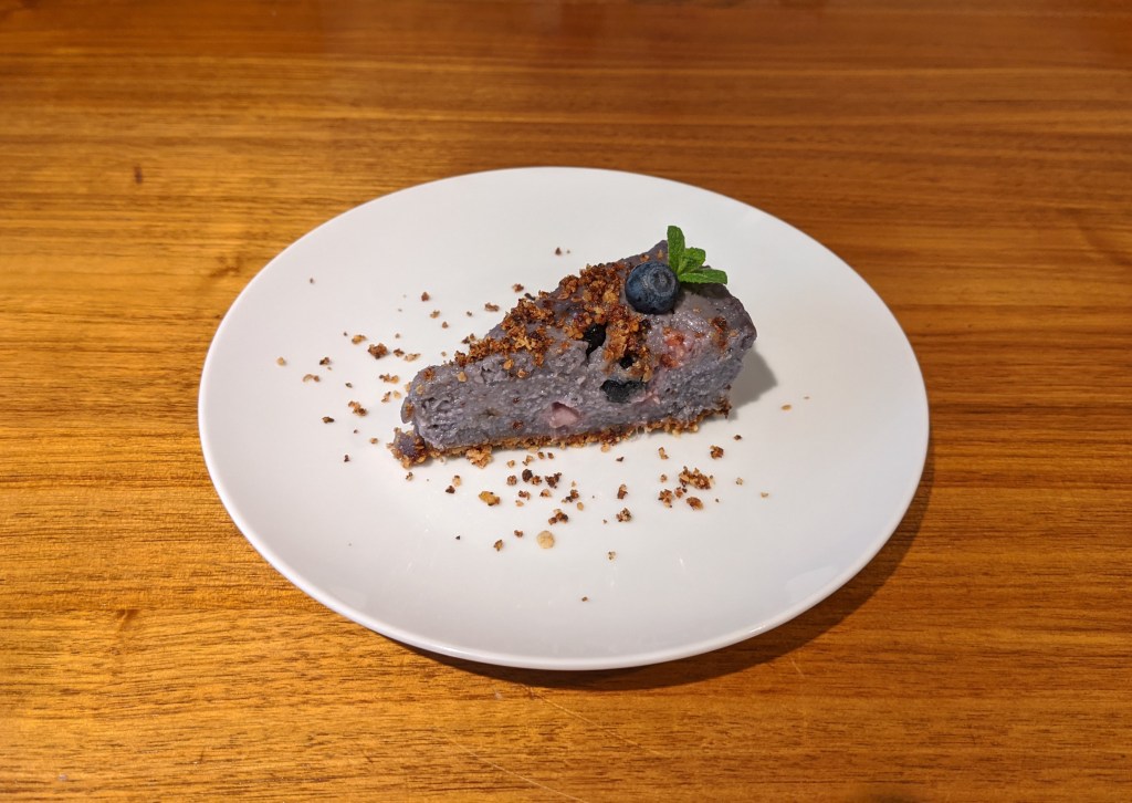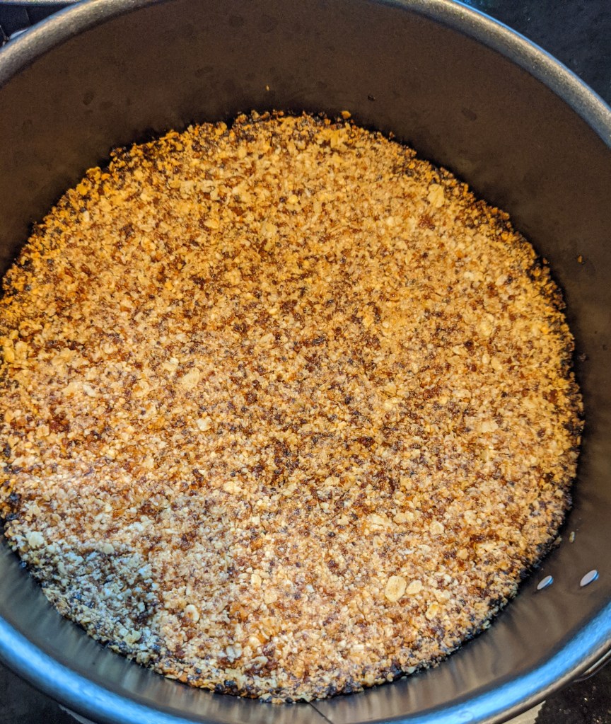 Für das Topping werden die Zutaten in Mixer verarbeitet. Die Masse in einer kleiner Springform oder auf ein hitzebeständiges Geschirr gleichmäßig verteilen. Nun werden die Topping-Masse und der Kuchenboden für 15 min gebacken. In der Zwischenzeit den Mixer mit Spülmittel reinigen. Nach 15 min Backzeit den Boden und das Topping rausholen und abkühlen lassen. Der Boden sollte ungefähr so aussehen: