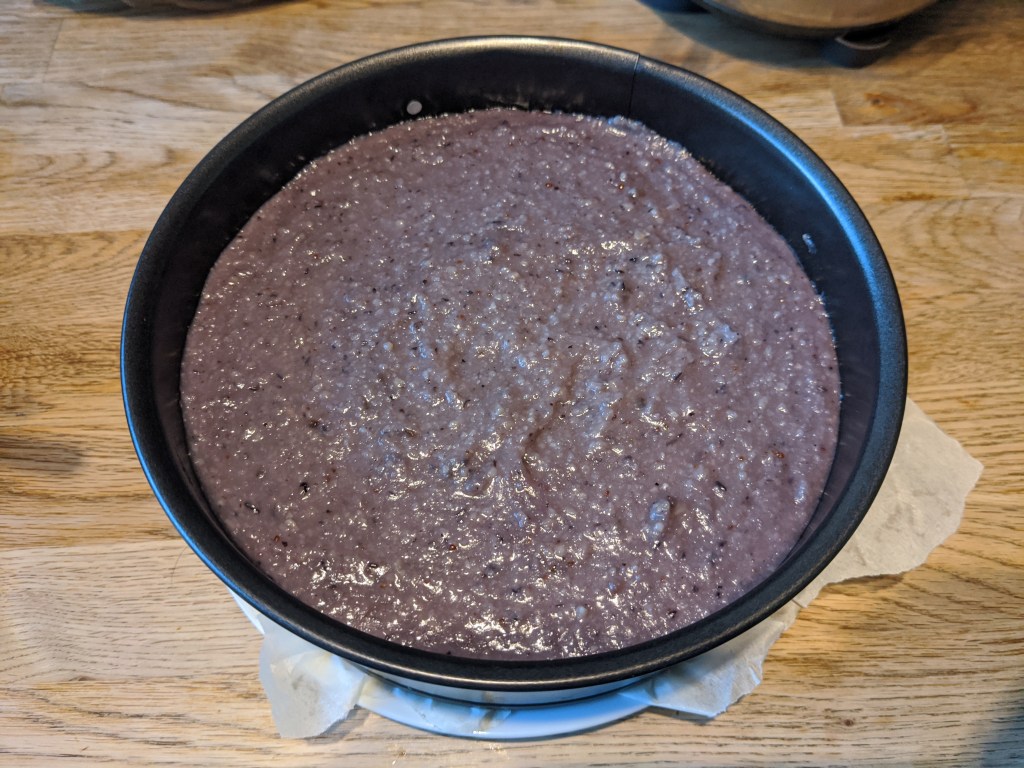 Bevor wir die Masse backen können, muss die Springform an den Seiten mit Öl bestrichen und der Boden der Springform wird mit Backpapier ausgelegt werden. Nachdem das erledigt ist, wird die die Masse in die Springform umgefüllt. Die Masse gleichmäßig verteilen und runterdrücken.